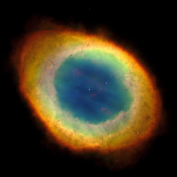 software. This was a 40- 5. Taken by the HST WFPC2 on October 16, 1998 and released to the public January 6, 1999. See the Hubble Heritage Program's press release and information links. The WFPC2 Handbook is the technical reference used by astronomers to plan observing sessions with this instrument. I rotated the image in Photoshop so that it would match the orientation in 4. The image was also cropped and scaled. The color HST image is a composite of exposures taken through three filters, each of which only lets in the light of a single emission line from a specific ionized molecule. The image from each filter is assigned to the RGB color channel nearest the wavelength it passes.
