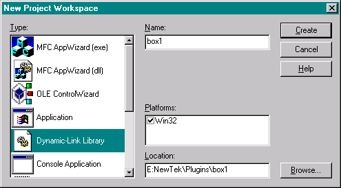 The ServerRecord array lists the plug-ins contained in a plug-in (.p) file. Our source code defines only one plug-in. Its class is LWMODCOMMAND_CLASS, its server name is "Tutorial_Box1" and its activation function is Activate. Although we don't use it here, the ServerRecord also allows you to specify a user name that differs from the server name, along with other information about the plug-in supplied as an array of tags. On each platform LightWave supports, the operating system provides a standard method of loading the .p file as a shared or dynamically-linked library and of obtaining the address within the library of the ServerRecord array. On Windows, for example, LightWave uses the Win32 LoadLibrary and GetProcAddress functions. Once LightWave has the address of the ServerRecord array, it can read the list of plug-ins in the file and find the activation functions. Building the Plug-in The Compiling page of the SDK gives detailed instructions for creating a .p file from your C source code. But the instructions there can be a little bewildering if your experience with setting compiler switches and building DLLs or shared libraries is limited. So I thought I'd show you how I build plug-ins on my own machine with the compiler I'm using, Microsoft Visual C++ version 4.0 Standard. This obviously won't be so helpful for people using different compilers and platforms, but hopefully it will at least demystify the process a little for them and demonstrate that no rocket science is involved.