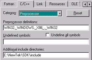 On the C/C++ tab, under Preprocessor, add _X86_ and _WIN32 to the preprocessor definitions. The SDK source and the lwdisplay.h header use these symbols to select platform-specific code. In the "Additional include directories:" field, enter the path to the SDK include directory.