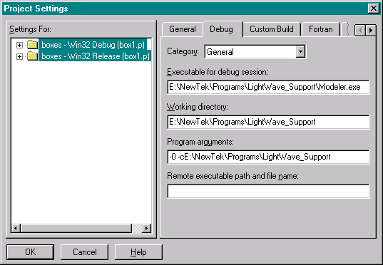 In the edit field labelled "Executable for debug session:", you'll enter the path to your installation of either Layout (Lightwav.exe) or Modeler (Modeler.exe), depending on which part of LightWave your plug-in is intended to run in. Our box plug-in runs in Modeler. The "Working directory:" will typically be the same as the "Start in:" directory for your LightWave installation. To find that, look on the Shortcut tab of the Properties panel for the icon or the Startup Menu entry that launches LightWave on your system. Also look there for the program arguments you normally use. I usually set mine to run without the Hub and to write the config files in the directory where the program files are. You might also want to add the -d switch, which runs the LightWave component in a "debug" mode. In this mode, plug-in files are always closed and detached when not in use, making it possible to recompile them while LightWave remains open. LightWave may also create a text file error dump when certain plug-in related problems occur.