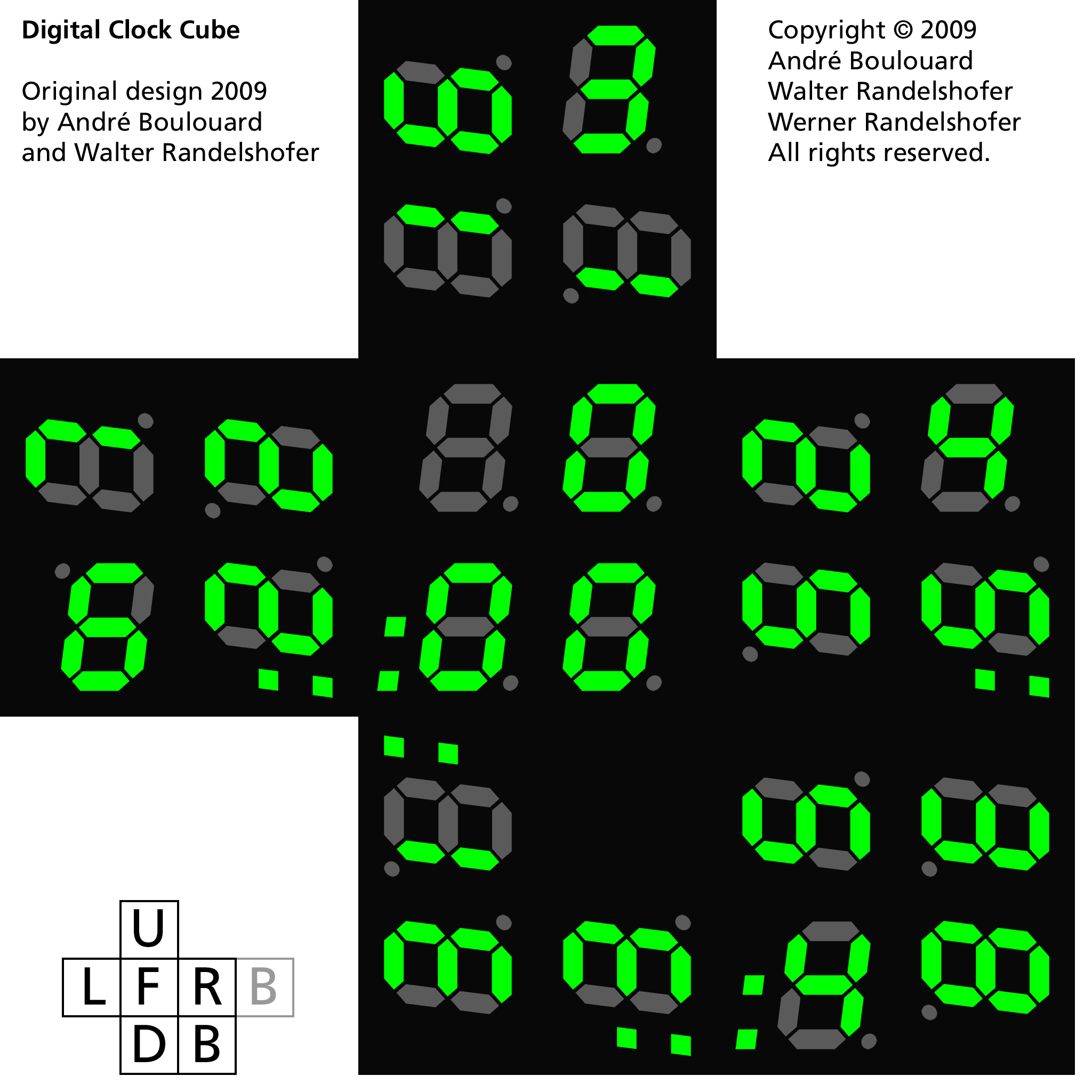 The layout of the Digital Clock Cube was created in 2009 by André Boulouard and Walter Randelshofer.