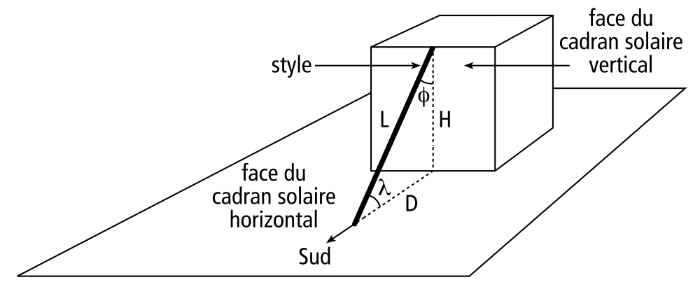 Un cadran solaire vertical et un cadran solaire horizontal peuvent être combinés en partageant le même style, car les angles du style sont complémentaires, c.a.d. de somme égale è 90°. Le plan du cadran solaire horizontal peut aussi être utilisé en tant que plaque support de cube. Dans ce cas, le style commun aux deux cadrans doit seulement être fixé sur le cadran horizontal et non pas sur le cube. La longueur 'L' du style commun et la distance 'D' de l'extrémité du style au cube sont données par: